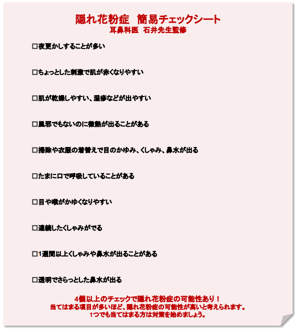 耳鼻科医の石井先生監修の「隠れ花粉症 簡易チェックシート」で、花粉症の可能性をチェック!
