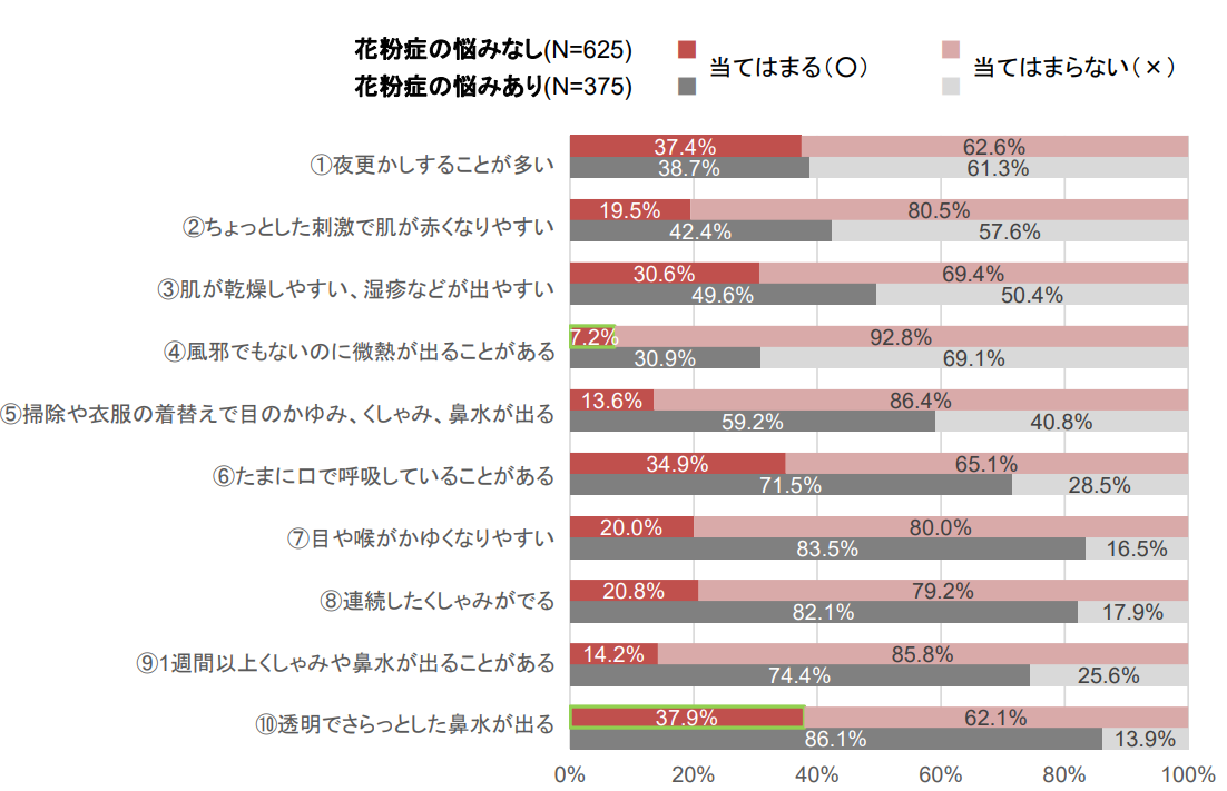 「隠れ花粉症」を調べる全10問の簡易テスト「隠れ花粉症 簡易チェックシート」を、石井先生に作成していただきました。今回の調査の結果、花粉症に悩まない回答者のうち、4問以上にチェックがついた「隠れ花粉症」は3割いることが判明しました。当てはまる方が最も多い項目は「10. 透明でさらっとした鼻水が出る」で、反対に最も当てはまる方が少ない項目は「 4. 風邪でもないのに微熱が出ることがある」でした。