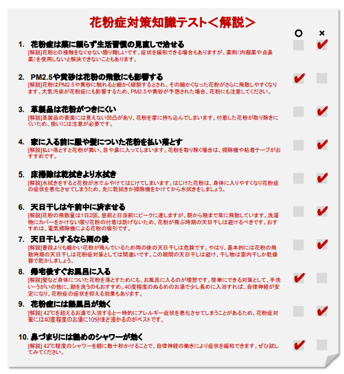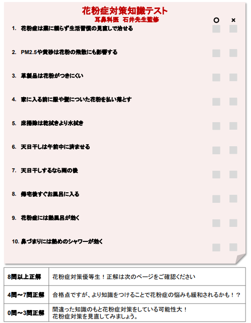 花粉症対策に関して正しく理解できているかどうかを確認する簡易テストを、石井先生に作成していただきました。