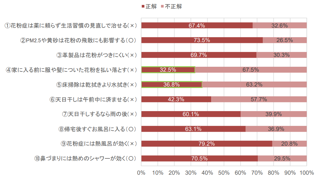 今回の調査の結果、全10問の「花粉症対策知識テスト」において、8点以上得点できた「花粉症対策優等生」は全体の1割しかいないことがわかりました。設問の中で最も正答率が低かったのは「4. 家に入る前に髪についた花粉を払い落とす」(正答は ×)、続いて「5. 床掃除は乾拭きより水拭き」でした(正答は × )。詳しい解説は前項目をご確認ください。
