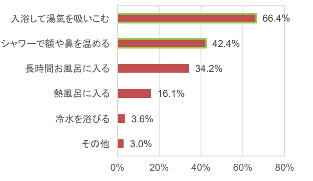 花粉症対策としてお風呂に入ると答えた方にお風呂の入り方についてきいてみました。その結果、「入浴して湯気を吸いこむ」と答えた方が7割と最も多く、「シャワーで額や鼻を温める」方が4割いることが判明しました。