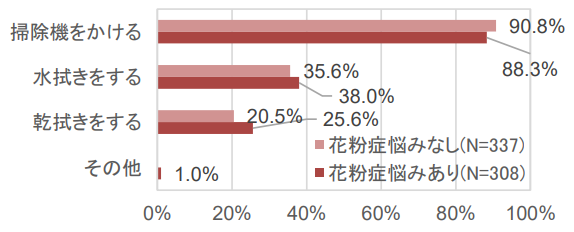 その他の花粉症対策について聞いてみました。部屋の掃除方法として最も多かったのは、「掃除機をかける」、続いて「水拭きをする」でした。