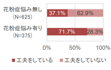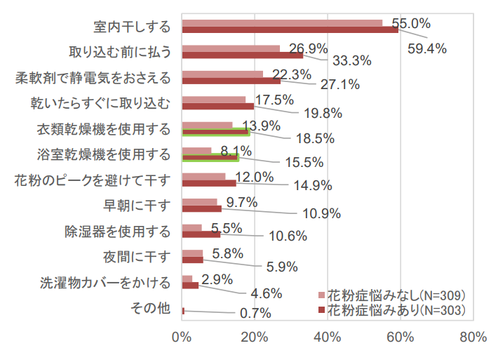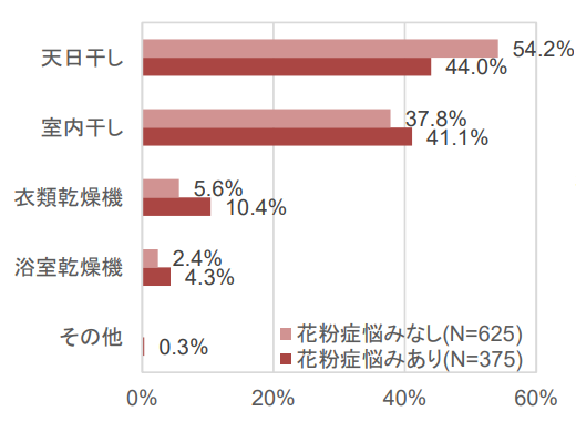 洗濯物の花粉症対策を聞いてみました。その結果「室内干しする」が6割と最も多い一方で、花粉症に悩む方の2割は「衣類乾燥機」や「浴室乾燥機」を活用していることが分かりました。