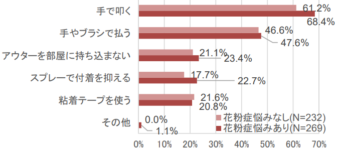 衣類の花粉を室内に持ち込まない方法は、「手で叩く」が最も多く、続いて「手やブラシで払う」でした。