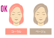 コーラル、ジンジャーカラー、ベージュなどの明るめの髪色だと血色感出て明るくフレッシュな印象になります。