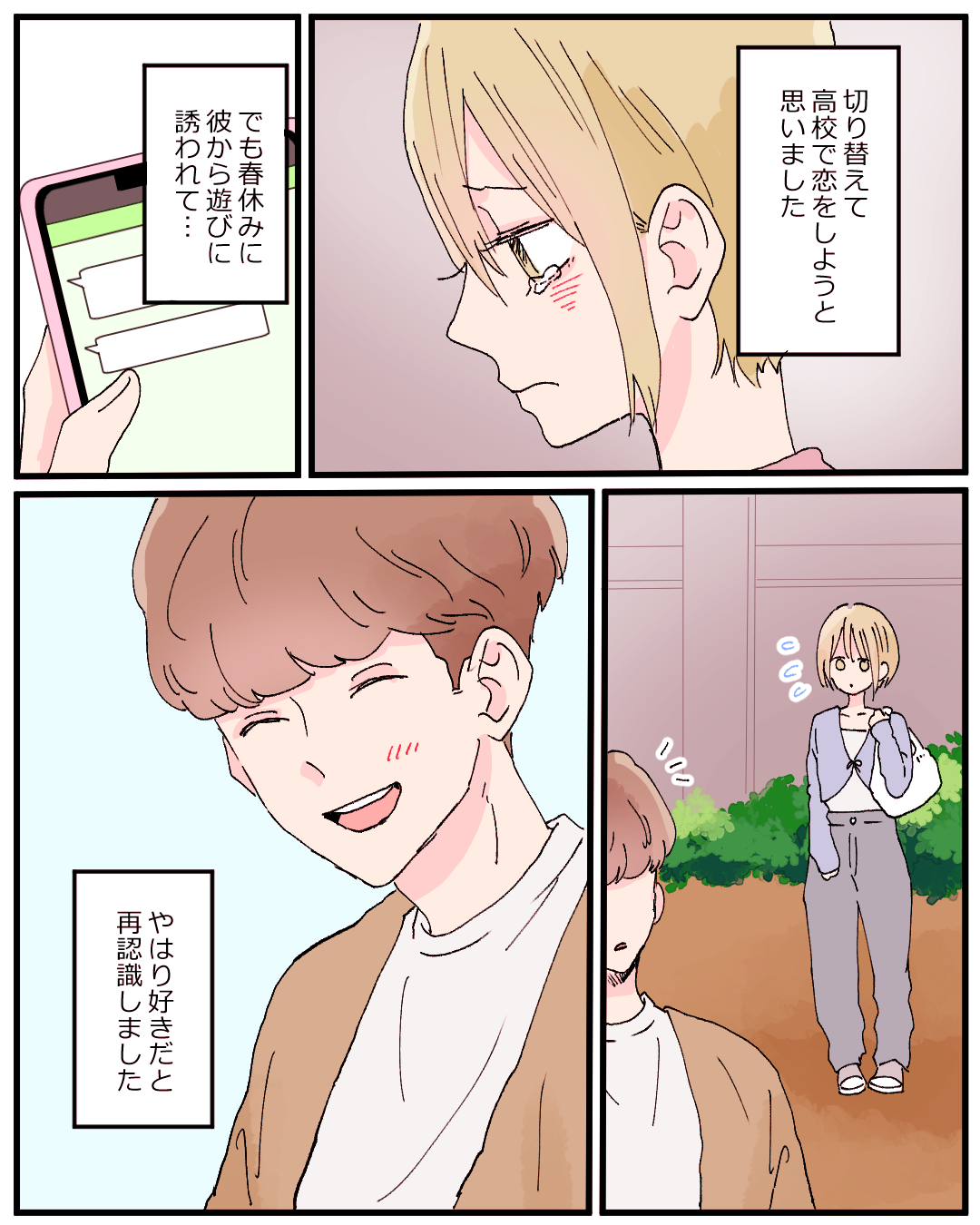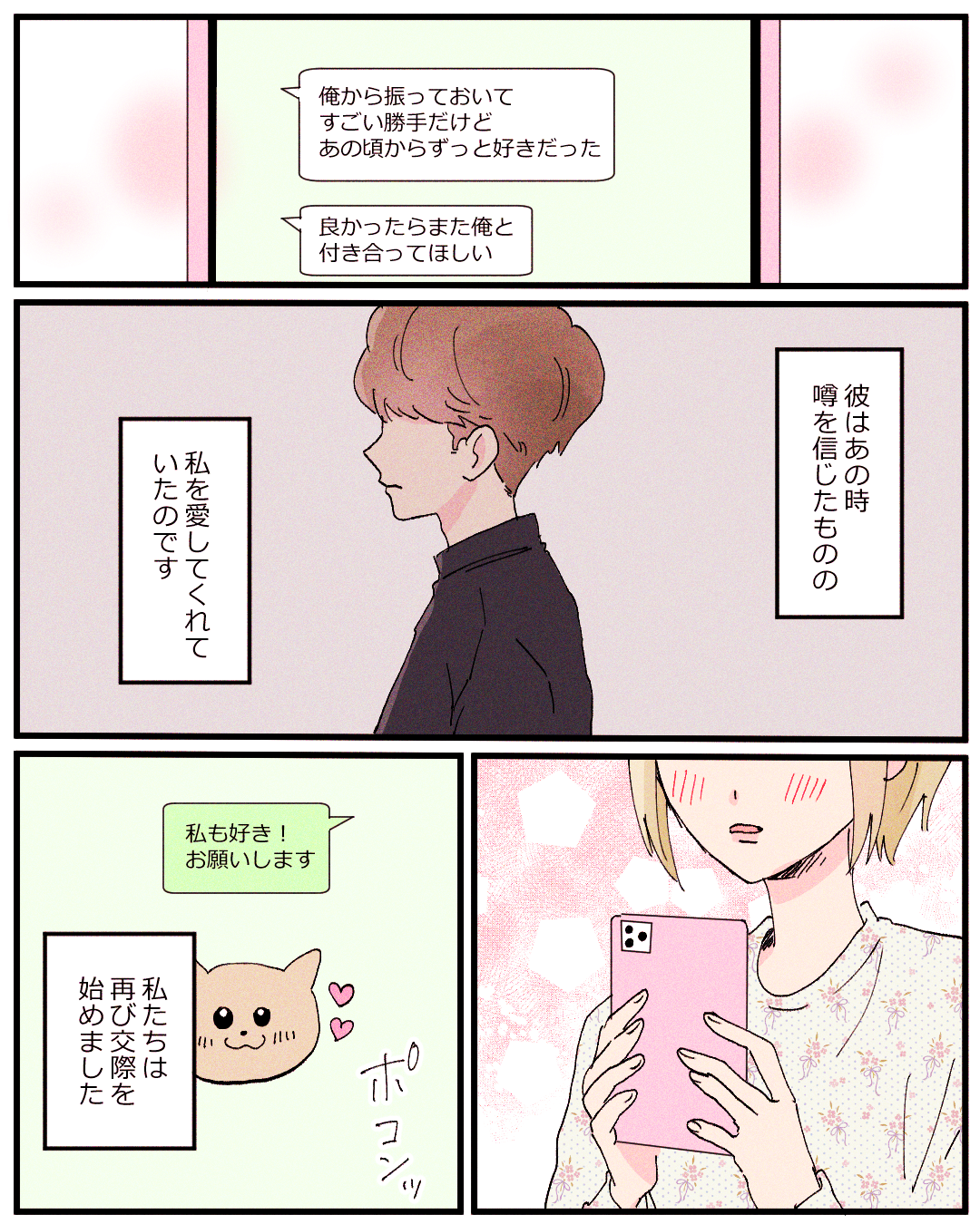 大好きな彼と復縁した話【Lovely漫画】 オリジナル漫画 2025年1月7日 目次 どんぐりさんの作品をもっと読む! どんぐりさんの作品一覧【Lovely漫画】 どんぐりさんの人気作をおまとめしています! こちらのLovely漫画もおすすめ! こじらせた初恋【Lovely漫画】 私の初恋は小学生の頃、友達の勧めで入ったサッカークラブのコーチだった。不完全燃焼で終わった初恋を引きずりながらも時は流れ、大学生になった私に彼氏ができた頃、久々にコーチから連絡があり…©どんぐり/エピソード:あちゃも 私の初恋と10年【Lovely漫画】 小学校から片思いをした彼に思い切って告白!無事に恋人になれたけれど…©ナナ/エピソード:みや 3年越しの復縁【Lovely漫画】 中2の時に初めてできた彼。なんと告白されてすぐに振られてしまった。その理由は…©倖/エピソード:まろん 連絡が途絶えて一ヶ月…彼の気持ちが知りたい!そんな時は復縁・縁結びに強い「電話占いカリス」へ[PR] 彼から距離を置きたいと告げられ連絡も途絶えた。ずっと待ってはみたものの、そろそろ解決の糸口が欲しい…!そんな方には復縁・縁結びに強い「電話占いカリス」がおすすめ!合格率わずか5%以下の厳選された占い師が、24時間体制であなたを幸せへと導くお手伝いをしてくれます。「当たる」占い師の力、少し借りてみませんか? ライター Lovely編集部 編集部レポや最新情報など皆さんの「知りたい」をお届け!よろしくお願いします♡ Related article / 関連記事 オリジナル漫画 メンヘラ彼氏にサヨナラ【Lovely漫画】 ©みんみ 2022年3月29日 オリジナル漫画 年下イケメン彼氏に翻弄されるオンナの毎日#3【Lovely漫画】 ©みんみ 2022年3月29日 オリジナル漫画 2人暮らしのゆる家事日記~気まぐれ旦那の献立作りの巻き~後編【Lovely漫画】 ©みんみ 2022年3月29日 オリジナル漫画 年下イケメン彼氏に翻弄されるオンナの毎日#1【Lovely漫画】 ©みんみ「初めての○○の話 前編」 2022年3月29日 オリジナル漫画 年下イケメン彼氏に翻弄されるオンナの毎日#2【Lovely漫画】 ©みんみ「初めての○○の話 後編」 2022年3月29日 1 2 オリジナル漫画 よかったらシェアしてね! URLをコピーしました! URLをコピーしました! 遠回りした話【Lovely漫画】 片思い男性へのLINE頻度はどのくらいがいい?【LINEの仕方】