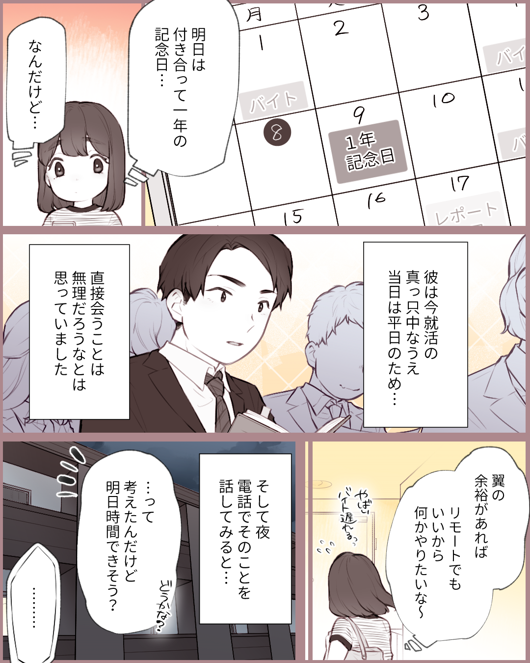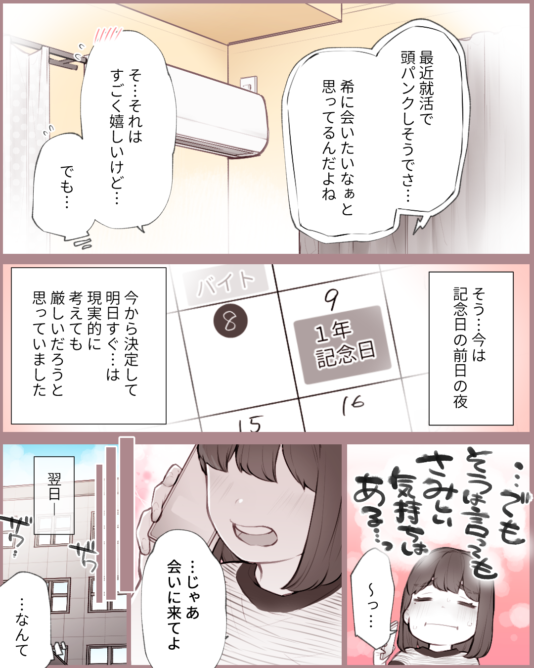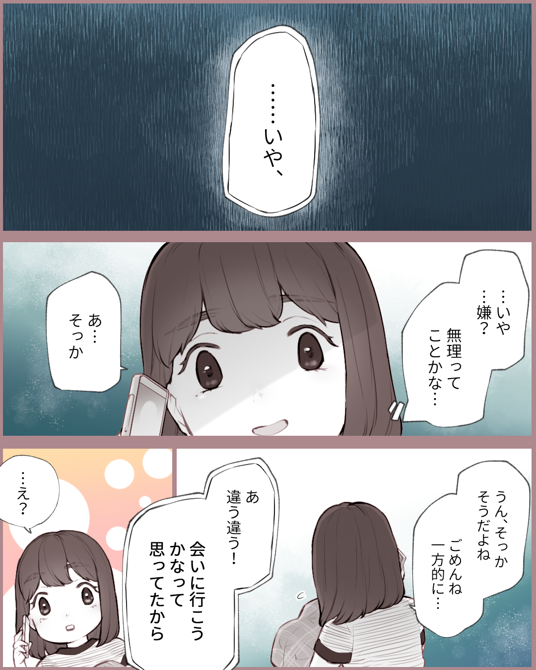 幸せな遠距離恋愛【Lovely漫画】 オリジナル漫画 2025年1月10日 目次Related article / 関連記事 遠距離 婚約ミサンガ【Lovely漫画】 彼が沖縄のおみやげをたくさん買ってきてくれた。その中にはミサンガも。すると彼が突然驚きの言葉を!?©しのだちかこ/エピソー… 2024年11月25日 遠距離 夜の電話【Lovely漫画】 年上彼氏と中距離恋愛中の私。毎晩の電話が日課になっています。ところが、今日の電話は彼の返事が素っ気なくて…。©なつ/エピソ… 2024年8月1日 遠距離 ポケットからキュンです♡【Lovely漫画】 遠距離の彼が精一杯気持ちを伝えてくれました♡©kurumi/エピソード:ちっち 2024年10月3日 遠距離 好きな人が出来たことが無い彼を好きにさせた話【Lovely漫画】 私が好きになったバイト先の店長は、「好き」という気持ちが分からない人で…。でも絶対に振り向かせてみせる!©しのだちかこ/エ… 2025年2月12日 遠距離 包容力のある彼氏が神だった件【Lovely漫画】 女の子の日の彼氏の対応に涙…♡©倖/エピソード:ももち 2024年10月4日 遠距離 6年前の恋に落ちた日【Lovely漫画】 丁寧なミシン作業の彼に惹かれて恋をした©ぴまを/エピソード:イチハ 2025年1月14日 遠距離 同期との運命の出会い【Lovely漫画】 研修で一緒になった同期に一目惚れした私。特に進展もなく迎えた研修最終日、彼から食事に誘われて…。©マナミン/エピソード:ゆ… 2024年8月6日 遠距離 寝落ち通話で素敵な夜を【Lovely漫画】 私の日課は、遠距離恋愛中の彼との寝落ち通話です。ある日、先に寝てしまった彼との通話を繋げたままにしていたら、予想外の展開に… 2024年8月5日 遠距離 遠距離中の彼との記念日旅行で…【Lovely漫画】 記念日旅行で、彼が不思議なゲームを提案してきて…?©しのだちかこ/エピソード:このは 2024年10月10日 遠距離 リモキュン【Lovely漫画】 遠距離だから会えないのに、リモートでさえもドキッとさせてくれる彼に惚れ直しちゃった!©おはぎ/エピソード:匿名 2022年3月29日 遠距離 中距離恋愛中の彼氏との誕生日【Lovely漫画】 埼玉と神奈川で中距離恋愛をしている私たち。週に1回の会える時間が楽しみだったのに、誕生日は彼が忙しいから会えないって…寂し… 2024年9月6日 遠距離 遠距離の覚悟【Lovely漫画】 高校で遠距離恋愛になった私たち。覚悟はしていたものの寂しくて、彼との電話中に涙が止まらなくなってしまったら…©倖/エピソー… 2024年12月20日 遠距離 私の決意【Lovely漫画】 東京と福岡で遠距離恋愛をしている私たち。ほんとはどんな時も一緒に居たいけど、こんな世の中でさらに会うのが難しくなった…。だ… 2024年9月20日 オリジナル漫画 出会いはフェリーで【Lovely漫画】 友達に会いに行くために乗った夜行フェリー。乗船前に見かけたイケメンも一緒に乗ってることがわかりドキドキ。また会えたらいいな… 2024年12月13日 遠距離 失敗した嫉妬【Lovely漫画】 チャットアプリで知り合った10歳年の差がある彼。いつも女友達と一緒の写真をいつも私に送ってくるのはなぜ…!?©サクライ/エ… 2024年8月16日 遠距離 長年の片想いに勝利した恋【Lovely漫画】 「重い。ゲームの邪魔になる」と振られた彼が忘れられなくて、彼との思い出を投稿エピソードにして気持ちを整理していた時。同い年… 2024年9月18日 遠距離 嬉し涙って出るんだ【Lovely漫画】 遠距離恋愛中の彼氏ともうすぐ付き合って1年の記念日。記念日には大好きなテーマパークに行こうねって約束をしていた…©おひつじ… 2022年3月29日 遠距離 思いがけないサプライズ【Lovely漫画】 東京と熊本で4歳年上の彼と遠距離恋愛中の私。5か月間会えない寂しさに少し負けそうになっていました。©れも/エピソード:みさ… 2025年2月4日 遠距離 不意打ちのやさしさ【Lovely漫画】 神戸と福岡で遠距離恋愛中の私たち。ある日、電話で彼と話をしていると…©しのだちかこ/エピソード:mim 2025年1月17日 遠距離 私たちの出会ったハワイ【Lovely漫画】 留学先で出会った彼。お互い惹かれ合い、付き合うことになったけれど…©どんぐり/エピソード:まる 2024年10月18日 1 2 オリジナル漫画 よかったらシェアしてね! URLをコピーしました! URLをコピーしました! モラハラ夫は改心するのか10【稲漫画】 神社参拝の作法:願い事を叶えるお参り方法とマナー