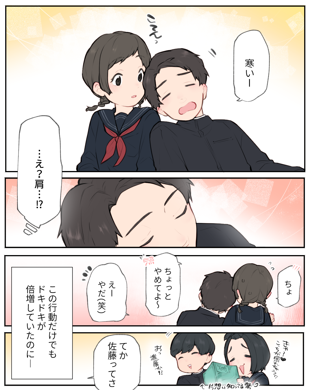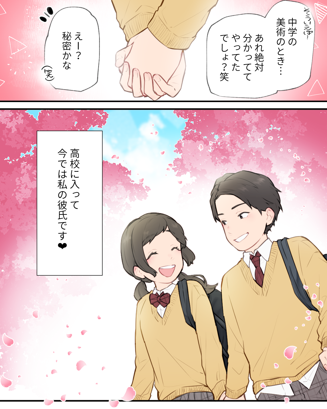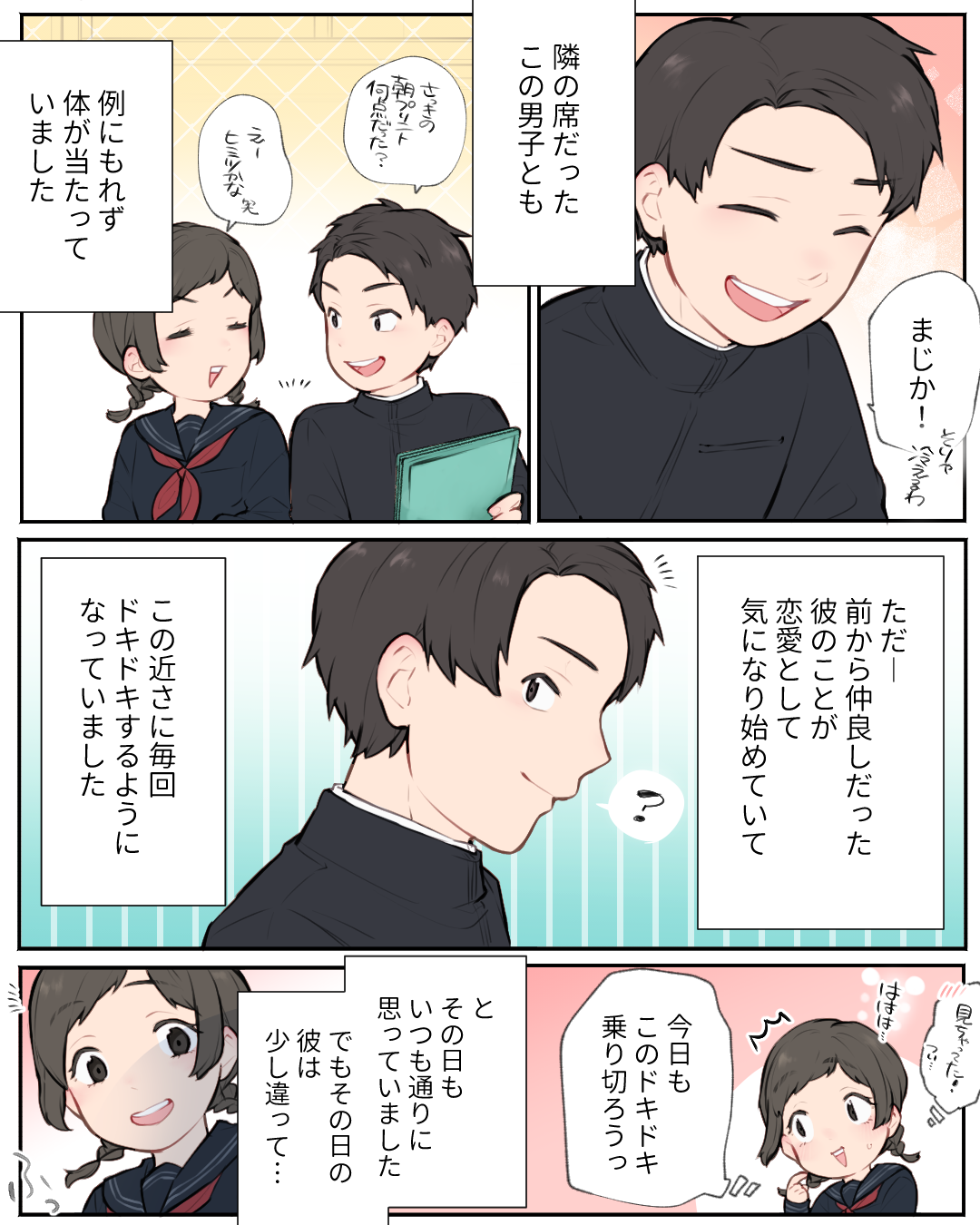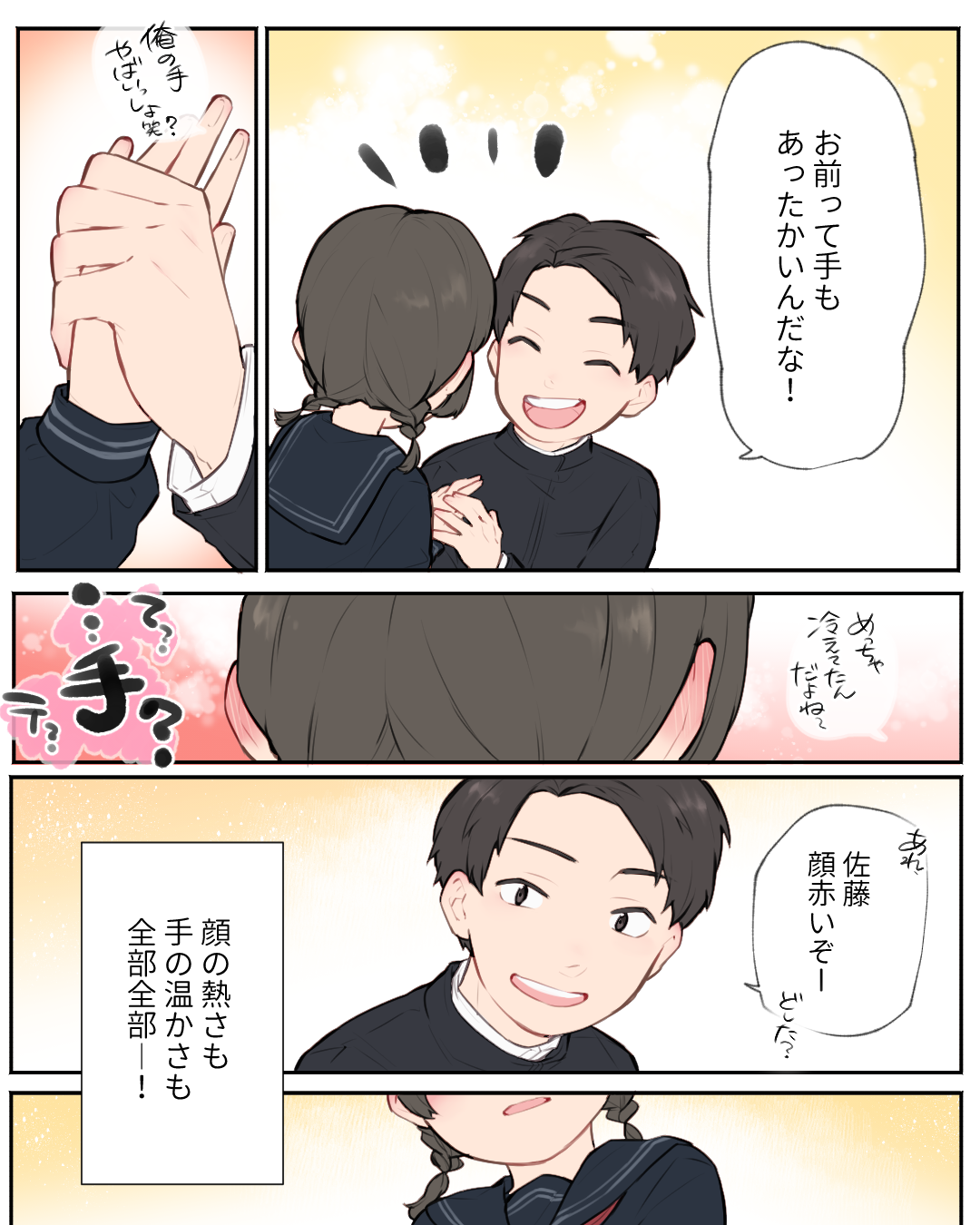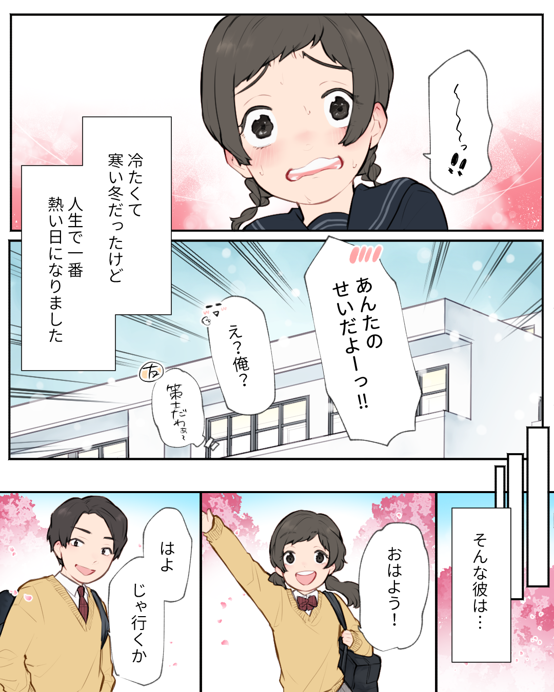 寒い冬も君がいれば【Lovely漫画】 オリジナル漫画 2024年9月10日 倖さんの作品をもっと読む! 倖さんの作品一覧【Lovely漫画】 倖さんの人気作をおまとめしています! こちらのLovely漫画もおすすめ! 身長よりも大きな気持ち【Lovely漫画】 身長は低いけどムードメーカーな後輩くん。あるきっかけで距離が近づき…©こがらしほゆき/エピソード:あおい 幸せを願って【Lovely漫画】 短大一年の夏、事務の神谷さんに一目惚れした私。がんばったものの、恋愛関係には進展しないまま卒業しました。数年後、短大を訪れた私は神谷さんと再会し…。©倖/エピソード:匿名 お節介なうざい奴【Lovely漫画】 中学生の時、喧嘩ばかりだったクラスメイト。10年ぶりの再会で気づけば二人で会うように…©どんぐり/エピソード:ななせ アプリから始まった恋愛【Lovely漫画】 アプリで出会った年下の彼と、初デートで初対面とは思えない程仲良くなり、徐々に惹かれていく私。けれど過去に恋愛の苦い思い出があり…?©倖/エピソード:あきら ライター Lovely編集部 編集部レポや最新情報など皆さんの「知りたい」をお届け!よろしくお願いします♡ 目次Related article / 関連記事 オリジナル漫画 メンヘラ彼氏にサヨナラ【Lovely漫画】 ©みんみ 2022年3月29日 オリジナル漫画 年下イケメン彼氏に翻弄されるオンナの毎日#3【Lovely漫画】 ©みんみ 2022年3月29日 オリジナル漫画 2人暮らしのゆる家事日記~気まぐれ旦那の献立作りの巻き~後編【Lovely漫画】 ©みんみ 2022年3月29日 オリジナル漫画 年下イケメン彼氏に翻弄されるオンナの毎日#1【Lovely漫画】 ©みんみ「初めての○○の話 前編」 2022年3月29日 オリジナル漫画 年下イケメン彼氏に翻弄されるオンナの毎日#2【Lovely漫画】 ©みんみ「初めての○○の話 後編」 2022年3月29日 オリジナル漫画 よかったらシェアしてね! URLをコピーしました! URLをコピーしました! 初めて両思いで付き合った話【Lovely漫画】 中学生女子がモテる女子になるには?モテる方法教えちゃいます!