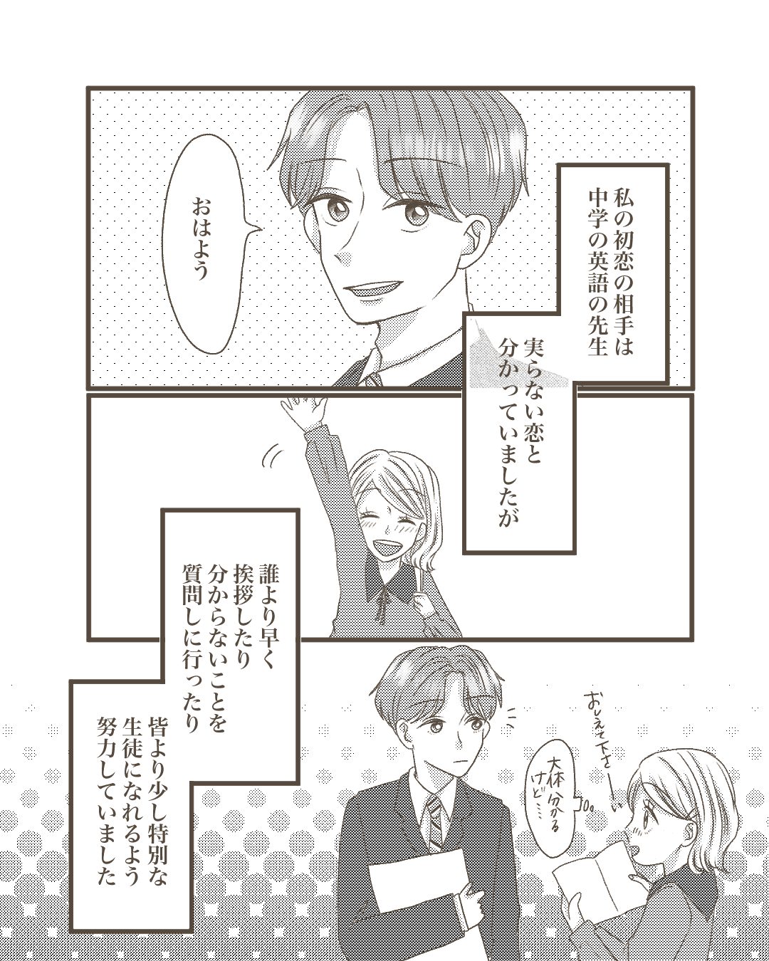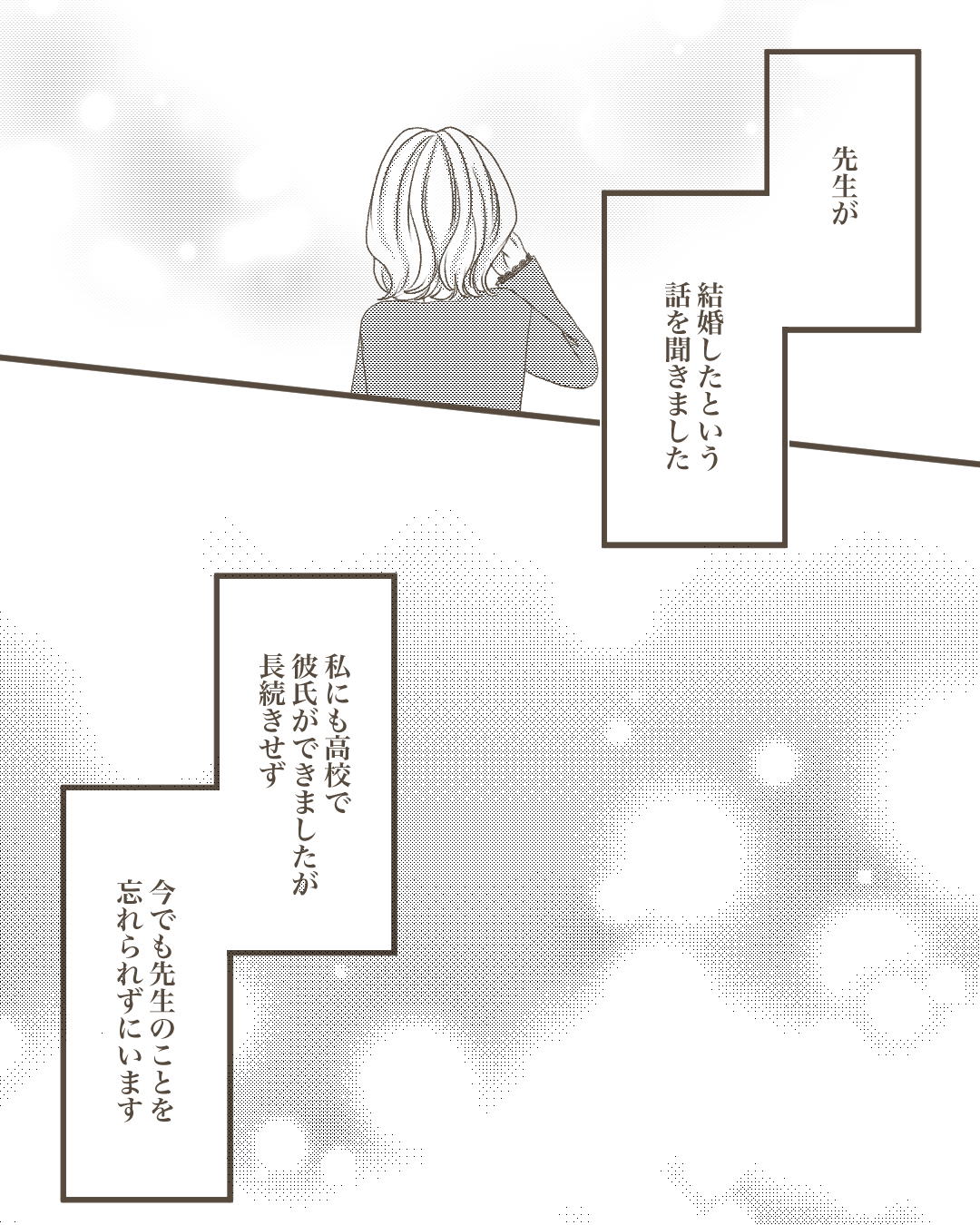 忘れられない先生への恋心【Lovely漫画】 オリジナル漫画 2023年11月14日 目次こちらのLovely漫画もおすすめ! 初恋は実らない?【Lovely漫画】 小学2年生で初めての告白。でも、まだその時は「恋」がわからなくて…©おはぎ/エピソード:えんぺらーーー 先生との恋【Lovely漫画】 塾の先生に片思い中。あるきっかけで、共通の趣味があることを知り…。©おはぎ/エピソード:Fujii 先生との思い出【Lovely漫画】 最初はパッとしないと思っていた先生がいつの間に雰囲気も変わり、生徒から信頼される人気者に。そんな先生と接するうちに私は惹かれていき…©おはぎ/エピソード:さでぃ 遠距離恋愛のカタチ【Lovely漫画】 高校から付き合っていた彼が卒業後、就職で遠方に。遠距離恋愛が始まり、慣れない大学生活の中、唯一の楽しみは彼との電話だった…©おひつじぐも/エピソード:あさげ ライター Lovely編集部 編集部レポや最新情報など皆さんの「知りたい」をお届け!よろしくお願いします♡ Related article / 関連記事 オリジナル漫画 メンヘラ彼氏にサヨナラ【Lovely漫画】 ©みんみ 2022年3月29日 オリジナル漫画 年下イケメン彼氏に翻弄されるオンナの毎日#3【Lovely漫画】 ©みんみ 2022年3月29日 オリジナル漫画 2人暮らしのゆる家事日記~気まぐれ旦那の献立作りの巻き~後編【Lovely漫画】 ©みんみ 2022年3月29日 オリジナル漫画 年下イケメン彼氏に翻弄されるオンナの毎日#1【Lovely漫画】 ©みんみ「初めての○○の話 前編」 2022年3月29日 オリジナル漫画 年下イケメン彼氏に翻弄されるオンナの毎日#2【Lovely漫画】 ©みんみ「初めての○○の話 後編」 2022年3月29日 オリジナル漫画 よかったらシェアしてね! URLをコピーしました! URLをコピーしました! ホワイトブリーチのセルフのやり方!市販品はドンキがおすすめ? ヘアカラートリートメント市販のおすすめ15選!白髪染めにぴったり?