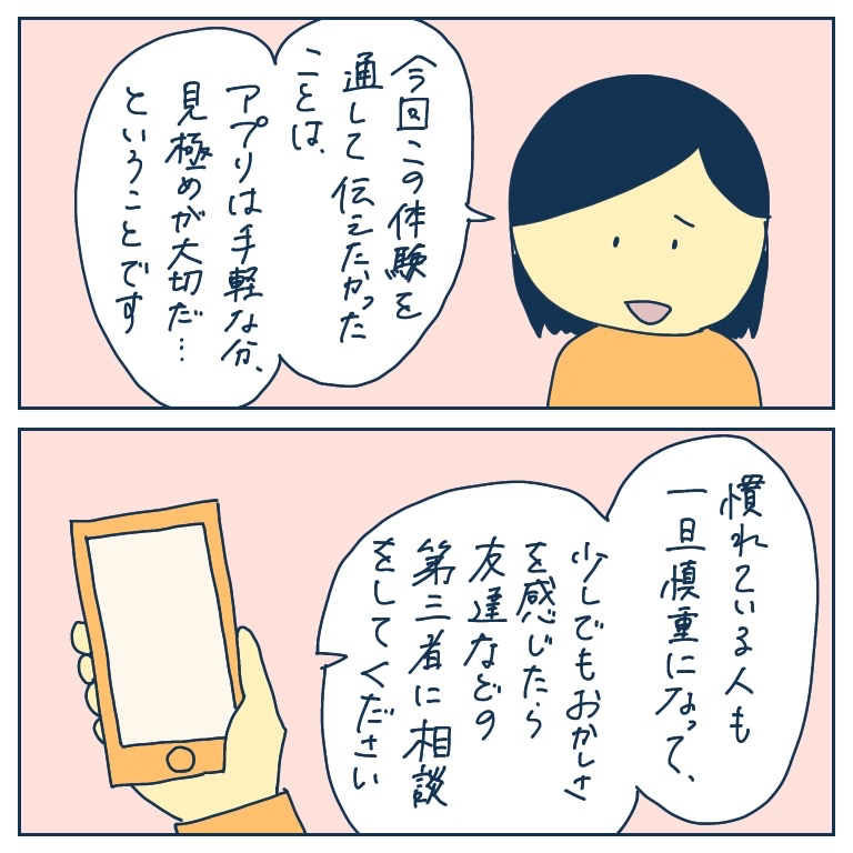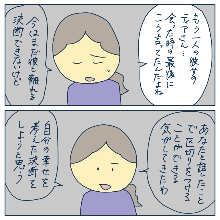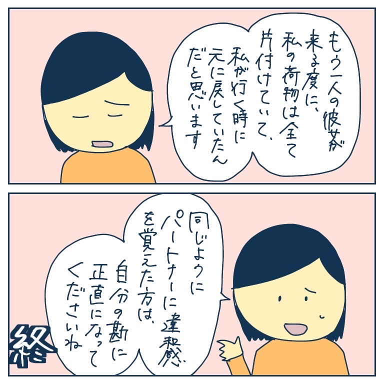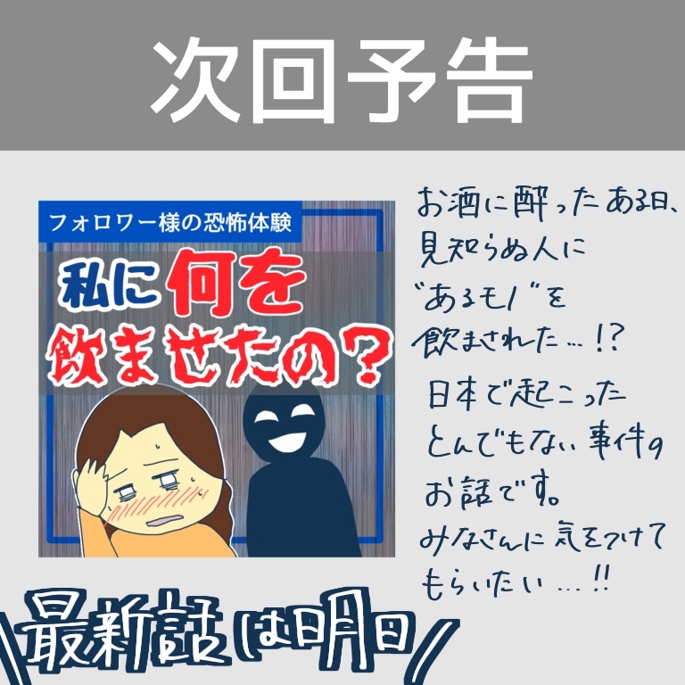 アプリで知り合った彼には別の彼女がいた!28【稲漫画】 オリジナル漫画 2022年11月29日 ▼前回のお話はこちら アプリで知り合った彼には別の彼女がいた!27【稲漫画】 アプリで出会った彼との恐怖体験と、そこからの脱出のエピソード。©稲 目次稲さんの連載一覧はこちら! 毎日更新!サラリーウーマン稲のエッセイ漫画 毎日更新!サラリーウーマン稲のエッセイ漫画 こちらのLovely漫画もおすすめ! 窓の向こう 1【magari漫画】 ※創作ホラーです。©magari 先生の裏の顔【Lovely漫画】 校門の前で言い争う2人の女性。そこに男性教諭が止めに入るとビンタされて…©えふ子/エピソード:匿名 嫌な女シリーズ②SNS監視女【Lovely漫画】 人気漫画家えふ子さんによる、Lovely初のオリジナルシリーズ! 彼氏や夫の周りにいたら嫌な女いますよね…。 ©えふ子 ライター 稲 エッセイ漫画を描くサラリーウーマン!Instagram【@inasan_mainichi】 Related article / 関連記事 オリジナル漫画 メンヘラ彼氏にサヨナラ【Lovely漫画】 ©みんみ 2022年3月29日 オリジナル漫画 年下イケメン彼氏に翻弄されるオンナの毎日#3【Lovely漫画】 ©みんみ 2022年3月29日 オリジナル漫画 2人暮らしのゆる家事日記~気まぐれ旦那の献立作りの巻き~後編【Lovely漫画】 ©みんみ 2022年3月29日 オリジナル漫画 年下イケメン彼氏に翻弄されるオンナの毎日#1【Lovely漫画】 ©みんみ「初めての○○の話 前編」 2022年3月29日 オリジナル漫画 年下イケメン彼氏に翻弄されるオンナの毎日#2【Lovely漫画】 ©みんみ「初めての○○の話 後編」 2022年3月29日 オリジナル漫画 よかったらシェアしてね! URLをコピーしました! URLをコピーしました! 塾の先生が好きかも?【Lovely漫画】 冬休み期間2022‐2023!【小学校・中学・高校・大学】