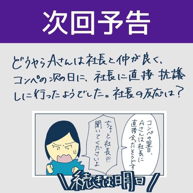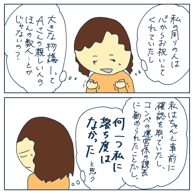 優勝した私が不正だ!と騒がれた話7【稲漫画】 オリジナル漫画 2023年1月4日 ▼前回のお話はこちら 優勝した私が不正だ!と騒がれた話6【稲漫画】 夫発案のアイディアで社内のコンペに応募したフォロワーさんに、とんでもない出来事が起こる…©稲 次を読む 優勝した私が不正だ!と騒がれた話8【稲漫画】 夫発案のアイディアで社内のコンペに応募したフォロワーさんに、とんでもない出来事が起こる…©稲 稲さんの連載一覧はこちら! 毎日更新!サラリーウーマン稲のエッセイ漫画 毎日更新!サラリーウーマン稲のエッセイ漫画 こちらのLovely漫画もおすすめ! 好きじゃない人と結婚した私の末路0【コメダ漫画】 人を好きになれない私が好きじゃない人と結婚するまでの物語©コメダ やばい夫婦のお話【Lovelyオリジナル漫画】 子どもの同級生の悠太くんと駿くんのママとパパは、子どもの行事は常に2人で来るほどの仲。でも2人の距離は年々近くなっているような感じが…。©えふ子/エピソード:匿名 女の勘【Lovely漫画】 半同棲中の彼氏がどうも怪しい。”女の勘”は当たり…。©倖/エピソード:砂糖さん ライター 稲 エッセイ漫画を描くサラリーウーマン!Instagram【@inasan_mainichi】 目次Related article / 関連記事 オリジナル漫画 メンヘラ彼氏にサヨナラ【Lovely漫画】 ©みんみ 2022年3月29日 オリジナル漫画 年下イケメン彼氏に翻弄されるオンナの毎日#3【Lovely漫画】 ©みんみ 2022年3月29日 オリジナル漫画 2人暮らしのゆる家事日記~気まぐれ旦那の献立作りの巻き~後編【Lovely漫画】 ©みんみ 2022年3月29日 オリジナル漫画 年下イケメン彼氏に翻弄されるオンナの毎日#1【Lovely漫画】 ©みんみ「初めての○○の話 前編」 2022年3月29日 オリジナル漫画 年下イケメン彼氏に翻弄されるオンナの毎日#2【Lovely漫画】 ©みんみ「初めての○○の話 後編」 2022年3月29日 オリジナル漫画 よかったらシェアしてね! URLをコピーしました! URLをコピーしました! ここの保育園ヤバイかも!?18【稲漫画】 しまむらのドレスがプチプラ可愛い!パーティードレスはこれで決まり!