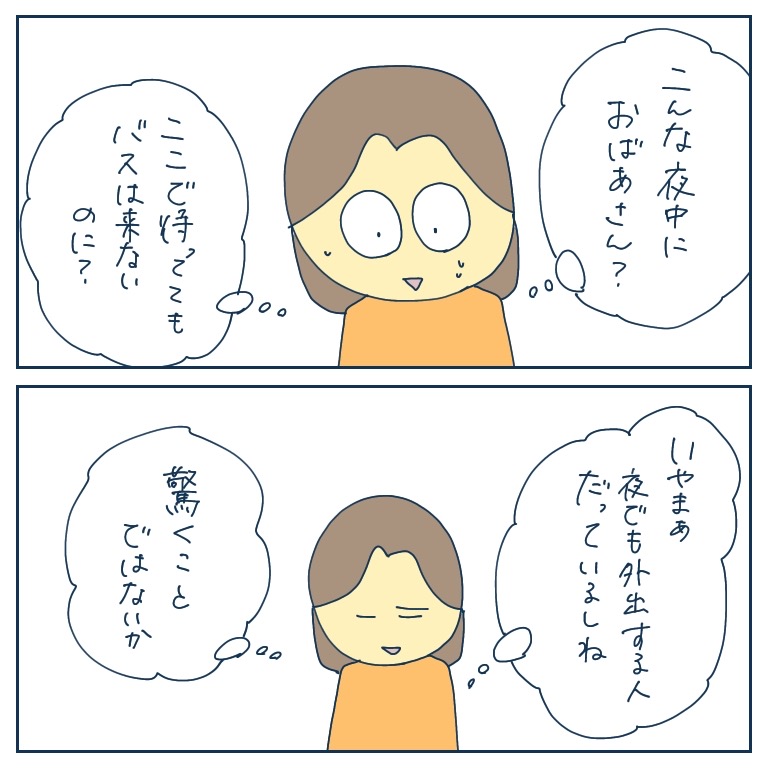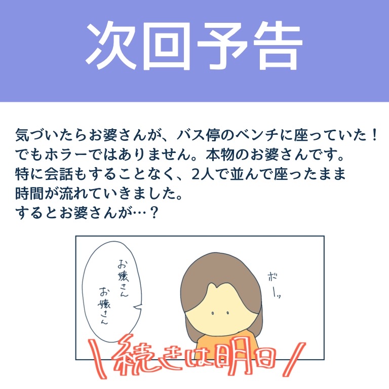 深夜のお婆さん2【稲漫画】 オリジナル漫画 2023年9月26日 前回のお話はこちら 深夜のお婆さん1【稲漫画】 中学時代から7年間付き合っていた彼と別れた帰り道、終バスにも乗らず深夜一人でベンチに座り込んでいると、隣に一人のお婆さんが。 「なぜこんな深夜に?」と思いながらお互いのことを話していると、お婆さんが深夜に一人外出していた理由が明らかになり…。©稲 稲さんの連載一覧はこちら! 毎日更新!サラリーウーマン稲のエッセイ漫画 毎日更新!サラリーウーマン稲のエッセイ漫画 こちらのLovely漫画もおすすめ♡ 彼の気持ちの先は…?【Lovely漫画】 配信アプリで仲良くなった彼。彼には気になる子がいて…©on/エピソード:ゆうぽん 優しさ×愛情のお弁当♡【Lovely漫画】 昨日は教室にお弁当箱を忘れて、お小遣いもピンチだから今日はお昼抜き…。空腹に耐えていたら、隣のクラスの彼氏が「屋上に行こう」と…。©倖/エピソード:モル インターホン押したのだぁれ? 1【magari漫画】 フォロワーさんが実際に体験したおはなし ©magari ライター 稲 エッセイ漫画を描くサラリーウーマン!Instagram【@inasan_mainichi】 目次Related article / 関連記事 オリジナル漫画 メンヘラ彼氏にサヨナラ【Lovely漫画】 ©みんみ 2022年3月29日 オリジナル漫画 年下イケメン彼氏に翻弄されるオンナの毎日#3【Lovely漫画】 ©みんみ 2022年3月29日 オリジナル漫画 2人暮らしのゆる家事日記~気まぐれ旦那の献立作りの巻き~後編【Lovely漫画】 ©みんみ 2022年3月29日 オリジナル漫画 年下イケメン彼氏に翻弄されるオンナの毎日#1【Lovely漫画】 ©みんみ「初めての○○の話 前編」 2022年3月29日 オリジナル漫画 年下イケメン彼氏に翻弄されるオンナの毎日#2【Lovely漫画】 ©みんみ「初めての○○の話 後編」 2022年3月29日 オリジナル漫画 よかったらシェアしてね! URLをコピーしました! URLをコピーしました! 口説いてきた人は○○だった10【稲漫画】 歴代ディズニー映画おすすめランキングTOP28!実写・アニメ別【2023年】