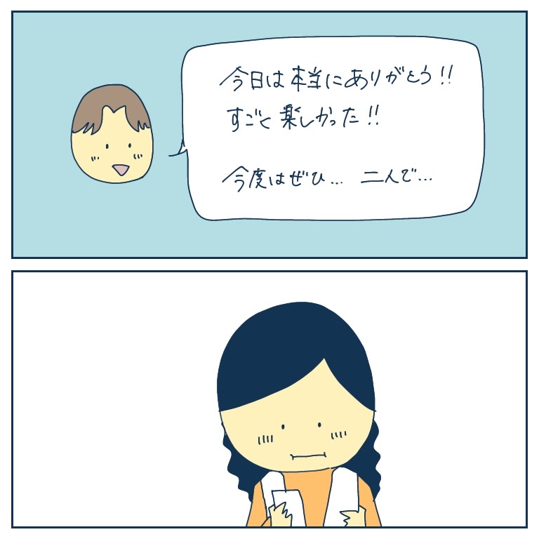 口説いてきた人は○○だった4【稲漫画】 オリジナル漫画 2023年9月22日 前回のお話はこちら 口説いてきた人は○○だった3【稲漫画】 すごく優しく、誠実で定評のある男性から口説かれた!! え…こんな素敵な人が…?好きになってもいいかな…? そう思っていたら、実はこの人○○であることが判明した。©稲 稲さんの連載一覧はこちら! 毎日更新!サラリーウーマン稲のエッセイ漫画 毎日更新!サラリーウーマン稲のエッセイ漫画 こちらのLovely漫画もおすすめ♡ 電車内でSNSをひらいたら…【magari漫画】 新作創作漫画です。©magari すれ違ってた時の話。1【ゆめの漫画】 くま=夫、ゆめの=妻が付き合った頃のおはなし©ゆめの 私、汚部屋の住民でした。1【渡部アキ漫画】 ©渡部アキ ライター 稲 エッセイ漫画を描くサラリーウーマン!Instagram【@inasan_mainichi】 目次Related article / 関連記事 オリジナル漫画 メンヘラ彼氏にサヨナラ【Lovely漫画】 ©みんみ 2022年3月29日 オリジナル漫画 年下イケメン彼氏に翻弄されるオンナの毎日#3【Lovely漫画】 ©みんみ 2022年3月29日 オリジナル漫画 2人暮らしのゆる家事日記~気まぐれ旦那の献立作りの巻き~後編【Lovely漫画】 ©みんみ 2022年3月29日 オリジナル漫画 年下イケメン彼氏に翻弄されるオンナの毎日#1【Lovely漫画】 ©みんみ「初めての○○の話 前編」 2022年3月29日 オリジナル漫画 年下イケメン彼氏に翻弄されるオンナの毎日#2【Lovely漫画】 ©みんみ「初めての○○の話 後編」 2022年3月29日 オリジナル漫画 よかったらシェアしてね! URLをコピーしました! URLをコピーしました! ブランドバッグ年代別ランキングTOP30!素敵なバッグを身につけよう! ユニクロのセールはいつやる?創業感謝祭の期間は?【2023】
