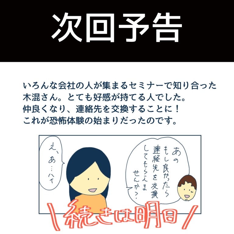付き合っていた彼は既婚者でした1【稲漫画】 オリジナル漫画 2024年4月1日 ▼次の話 付き合っていた彼は既婚者でした2【稲漫画】 とあるセミナーで出会い、付き合うことになった彼。最初はとても順調に思えていた交際のはずが、あるメールをきっかけに驚くべき真実が明らかに・・・?稲 稲さんの連載一覧はこちら! 毎日更新!サラリーウーマン稲のエッセイ漫画 毎日更新!サラリーウーマン稲のエッセイ漫画 こちらのLovely漫画もおすすめ♡ クズ男の末路【Lovely漫画】 一目惚れした彼に一生懸命アプローチし、2人で会う仲に。ただ、あることをきっかけに彼の本性に気づき…©カンザキミナミ/エピソード:匿名 浮気の代償は…【Lovely漫画】 一瞬の気の迷い一生の後悔…©匿名/エピソード:匿名 仮面のオトコ<前編>【Lovely漫画】 資格取得スクールで出会った男性講師。彼と深い関係になるのに時間はかからなかった。しかし、彼には私の知らない秘密があって…!©あやたきくこ/エピソード:匿名 ライター 稲 エッセイ漫画を描くサラリーウーマン!Instagram【@inasan_mainichi】 目次Related article / 関連記事 オリジナル漫画 メンヘラ彼氏にサヨナラ【Lovely漫画】 ©みんみ 2022年3月29日 オリジナル漫画 年下イケメン彼氏に翻弄されるオンナの毎日#3【Lovely漫画】 ©みんみ 2022年3月29日 オリジナル漫画 2人暮らしのゆる家事日記~気まぐれ旦那の献立作りの巻き~後編【Lovely漫画】 ©みんみ 2022年3月29日 オリジナル漫画 年下イケメン彼氏に翻弄されるオンナの毎日#1【Lovely漫画】 ©みんみ「初めての○○の話 前編」 2022年3月29日 オリジナル漫画 年下イケメン彼氏に翻弄されるオンナの毎日#2【Lovely漫画】 ©みんみ「初めての○○の話 後編」 2022年3月29日 オリジナル漫画 よかったらシェアしてね! URLをコピーしました! URLをコピーしました! まっすぐな恋【Lovely漫画】 男装メイクの上手なやり方!順番やアイテムの選び方など