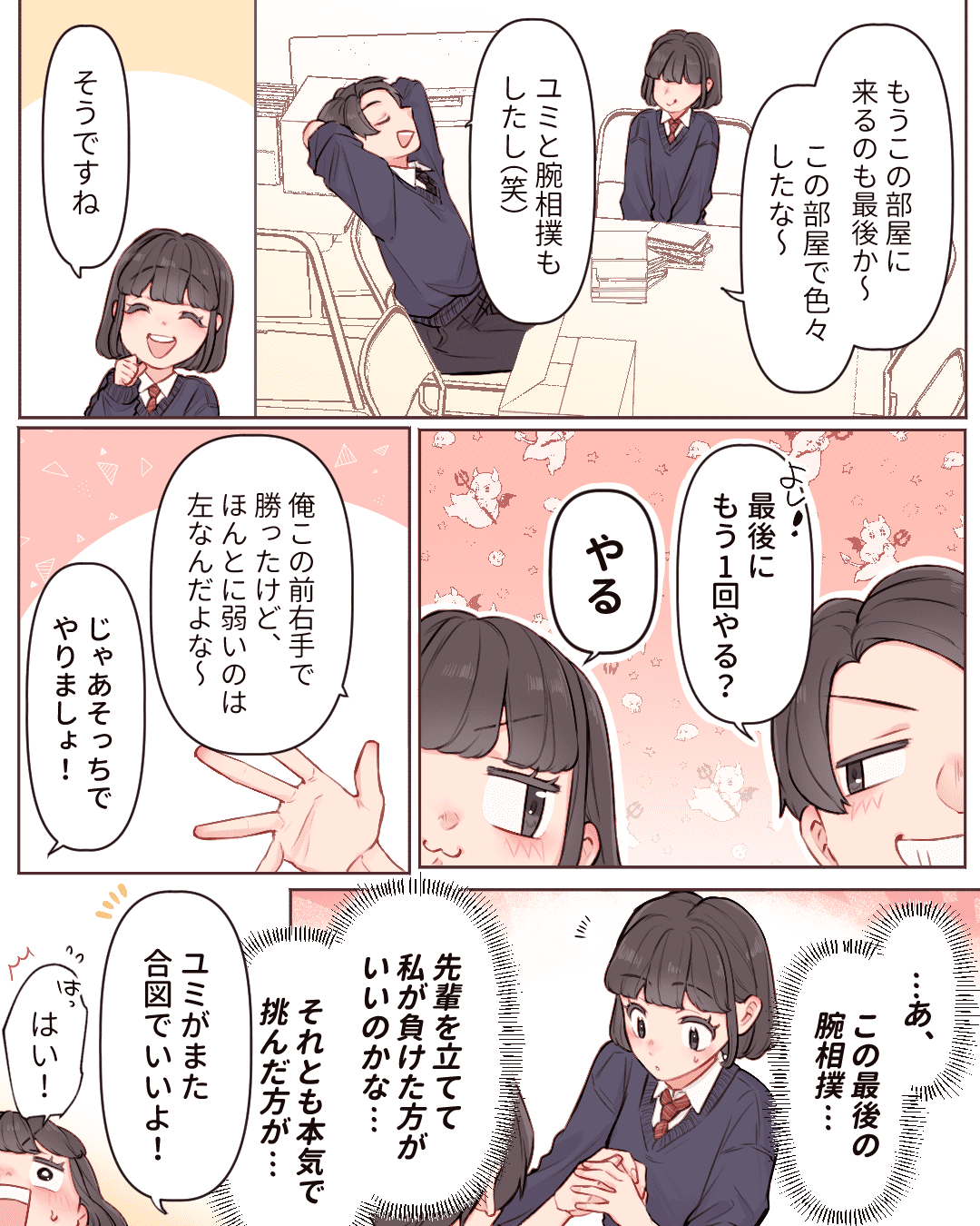 先輩と腕相撲で距離が縮んだ話【Lovely漫画】 オリジナル漫画 2024年11月12日 目次 倖さんの作品をもっと読む! 倖さんの作品一覧【Lovely漫画】 倖さんの人気作をおまとめしています! こちらのLovely漫画もおすすめ♡ 帰り際に…【Lovely漫画】 大学の年上彼氏とのドライブデートの帰り。その別れ際のできごと…©みほ/エピソード:リリバシちゃん 彼の日常【Lovely漫画】 私の彼は大好きな趣味があります。付き合う前から知っていたので、付き合ってからも何も思うことはありませんでした。しかし…©サクライ/エピソード:おむらいす 98%ツンな彼女【Lovely漫画】 その2%がめちゃくちゃ可愛い俺の彼女!©Sui/エピソード:ダージリン 最高の誕生日【Lovely漫画】 別れが惜しいなあ…って気持ちが届いた?!©Sui/エピソード:匿名 ライター Lovely編集部 編集部レポや最新情報など皆さんの「知りたい」をお届け!よろしくお願いします♡ Related article / 関連記事 オリジナル漫画 メンヘラ彼氏にサヨナラ【Lovely漫画】 ©みんみ 2022年3月29日 オリジナル漫画 年下イケメン彼氏に翻弄されるオンナの毎日#3【Lovely漫画】 ©みんみ 2022年3月29日 オリジナル漫画 2人暮らしのゆる家事日記~気まぐれ旦那の献立作りの巻き~後編【Lovely漫画】 ©みんみ 2022年3月29日 オリジナル漫画 年下イケメン彼氏に翻弄されるオンナの毎日#1【Lovely漫画】 ©みんみ「初めての○○の話 前編」 2022年3月29日 オリジナル漫画 年下イケメン彼氏に翻弄されるオンナの毎日#2【Lovely漫画】 ©みんみ「初めての○○の話 後編」 2022年3月29日 1 2 オリジナル漫画 よかったらシェアしてね! URLをコピーしました! URLをコピーしました! 彼の言葉で決心した話【Lovely漫画】 優しい顔になれちゃうメイクテク!優しい顔になりたい人必見!