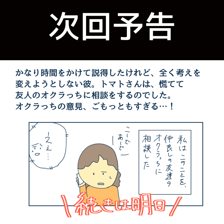 プライドだけ一丁前の男に騙されちゃダメ10【稲漫画】 オリジナル漫画 2024年8月13日 ▼前回のお話 プライドだけ一丁前の男に騙されちゃダメ9【稲漫画】 主人公トマトさんにできた初彼氏。最初は意識が高くてカッコイイ人だと思っていたが、プライドだけ一丁前の口だけ男だった…?!©稲 ▼次の話 プライドだけ一丁前の男に騙されちゃダメ11【稲漫画】 主人公トマトさんにできた初彼氏。最初は意識が高くてカッコイイ人だと思っていたが、プライドだけ一丁前の口だけ男だった…?!©稲 稲さんの連載一覧はこちら! 毎日更新!サラリーウーマン稲のエッセイ漫画 毎日更新!サラリーウーマン稲のエッセイ漫画 こちらのLovely漫画もおすすめ♡ ゾゾッ!婚活パーティに潜んでいた恐怖 1【稲漫画】 婚活パーティで体験した恐怖の話 ©稲 恐怖のストーカー1【稲漫画】 20歳のときにストーカーされた恐怖体験©稲 彼氏の恐怖の本性1【稲漫画】 当時付き合っていた彼の恐ろしい本性とは…?©稲 ライター 稲 エッセイ漫画を描くサラリーウーマン!Instagram【@inasan_mainichi】 目次Related article / 関連記事 オリジナル漫画 メンヘラ彼氏にサヨナラ【Lovely漫画】 ©みんみ 2022年3月29日 オリジナル漫画 年下イケメン彼氏に翻弄されるオンナの毎日#3【Lovely漫画】 ©みんみ 2022年3月29日 オリジナル漫画 2人暮らしのゆる家事日記~気まぐれ旦那の献立作りの巻き~後編【Lovely漫画】 ©みんみ 2022年3月29日 オリジナル漫画 年下イケメン彼氏に翻弄されるオンナの毎日#1【Lovely漫画】 ©みんみ「初めての○○の話 前編」 2022年3月29日 オリジナル漫画 年下イケメン彼氏に翻弄されるオンナの毎日#2【Lovely漫画】 ©みんみ「初めての○○の話 後編」 2022年3月29日 オリジナル漫画 よかったらシェアしてね! URLをコピーしました! URLをコピーしました! プライドだけ一丁前の男に騙されちゃダメ6【稲漫画】 告白のセリフ集!かっこいい言葉で女性を胸キュンさせよう!