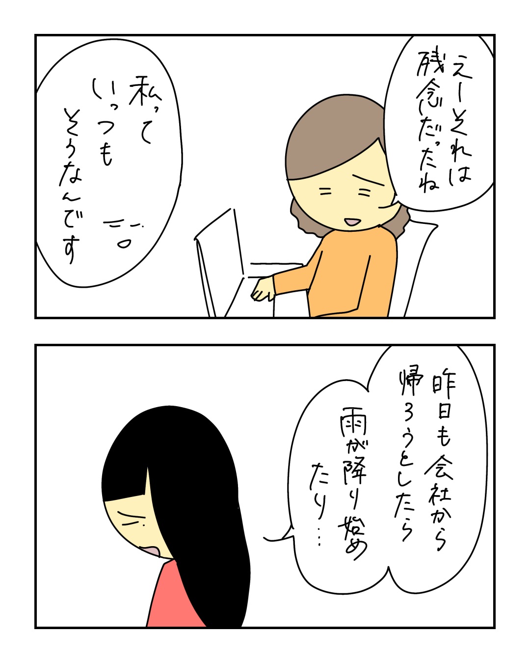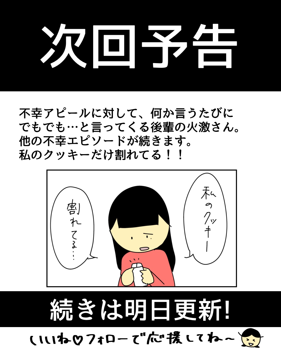 不幸アピールする後輩にウンザリ2【稲漫画】 オリジナル漫画 2025年3月13日 ▼前回のお話 不幸アピールする後輩にウンザリ1【稲漫画】 会社で教育担当者に任命された主人公。しかし、相手は入社して早々から不幸アピールがすごい、クセ強な後輩だった。そんな後輩が次々と起こす事件に頭を悩ませる日々が始まる…!©稲 ▼次の話 不幸アピールする後輩にウンザリ3【稲漫画】 会社で教育担当者に任命された主人公。しかし、相手は入社して早々から不幸アピールがすごい、クセ強な後輩だった。そんな後輩が次々と起こす事件に頭を悩ませる日々が始まる…!©稲 稲さんの連載一覧はこちら! 毎日更新!サラリーウーマン稲のエッセイ漫画 毎日更新!サラリーウーマン稲のエッセイ漫画 こちらのLovely漫画もおすすめ♡ 私に何をしようとしたの?というはなし1【稲漫画】 「どういうこと?」と謎の残る恐怖体験!©稲 カットモデル不審者のはなし1【稲漫画】 試験でクタクタだった高校生の恐怖体験!©稲 恐怖のお姫様ごっこをさせられたはなし1【稲漫画】 小学2年生の夏休みに起きた恐怖体験…!©稲 ライター 稲 エッセイ漫画を描くサラリーウーマン!Instagram【@inasan_mainichi】 目次Related article / 関連記事 オリジナル漫画 メンヘラ彼氏にサヨナラ【Lovely漫画】 ©みんみ 2022年3月29日 オリジナル漫画 年下イケメン彼氏に翻弄されるオンナの毎日#3【Lovely漫画】 ©みんみ 2022年3月29日 オリジナル漫画 2人暮らしのゆる家事日記~気まぐれ旦那の献立作りの巻き~後編【Lovely漫画】 ©みんみ 2022年3月29日 オリジナル漫画 年下イケメン彼氏に翻弄されるオンナの毎日#1【Lovely漫画】 ©みんみ「初めての○○の話 前編」 2022年3月29日 オリジナル漫画 年下イケメン彼氏に翻弄されるオンナの毎日#2【Lovely漫画】 ©みんみ「初めての○○の話 後編」 2022年3月29日 オリジナル漫画 よかったらシェアしてね! URLをコピーしました! URLをコピーしました! 不幸アピールする後輩にウンザリ1【稲漫画】 不幸アピールする後輩にウンザリ3【稲漫画】
