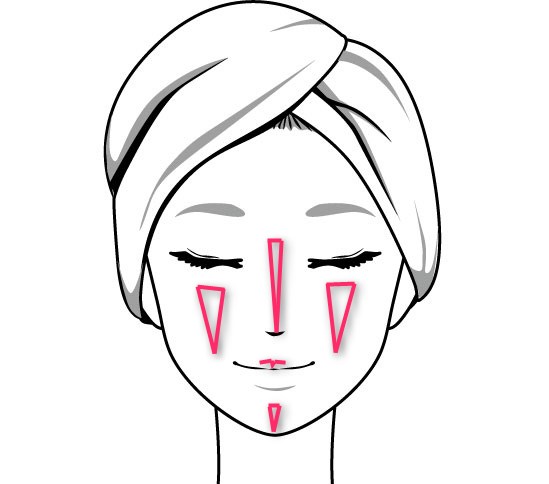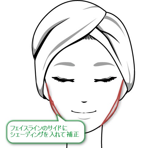 シェーディングの範囲は、顔を正面から見たときに卵型にファンデーションを残して、そこからはみ出した部分をシェーディングしてあげます。