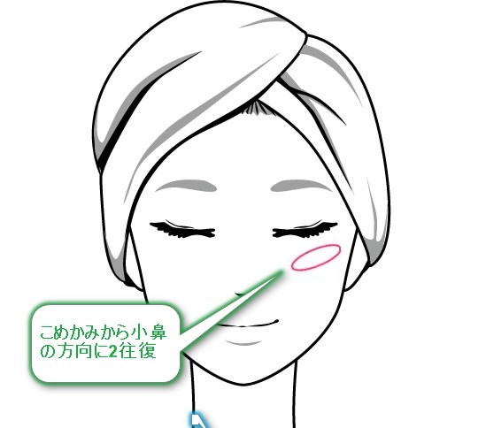 頬骨の一番高いところから、小鼻に向けてチークを乗せて上げましょう。チークを乗せるときも口角を上げた状態にするのがコツです。チークが低い位置に入ってしまうと、目線が下に下がります。すると下に間延びしたような雰囲気になって、丸顔さんから下膨れさんに。
