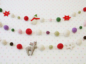 下の写真は、色々なボールを糸に通して、壁に飾り付けています。