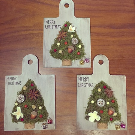 下の写真は、木のお皿にをベースにつくった飾りです。