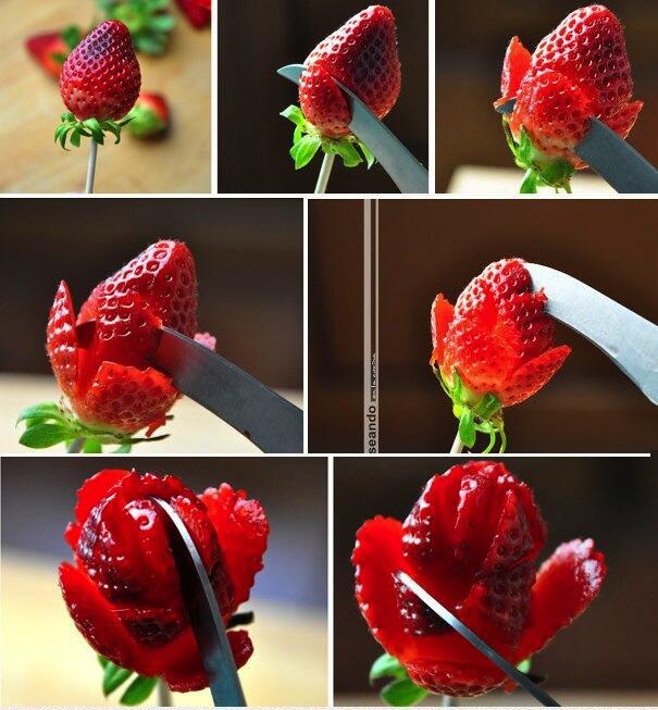 ナイフで、下の写真の様に、いちごの下の方から切込みを入れていけば完成です。