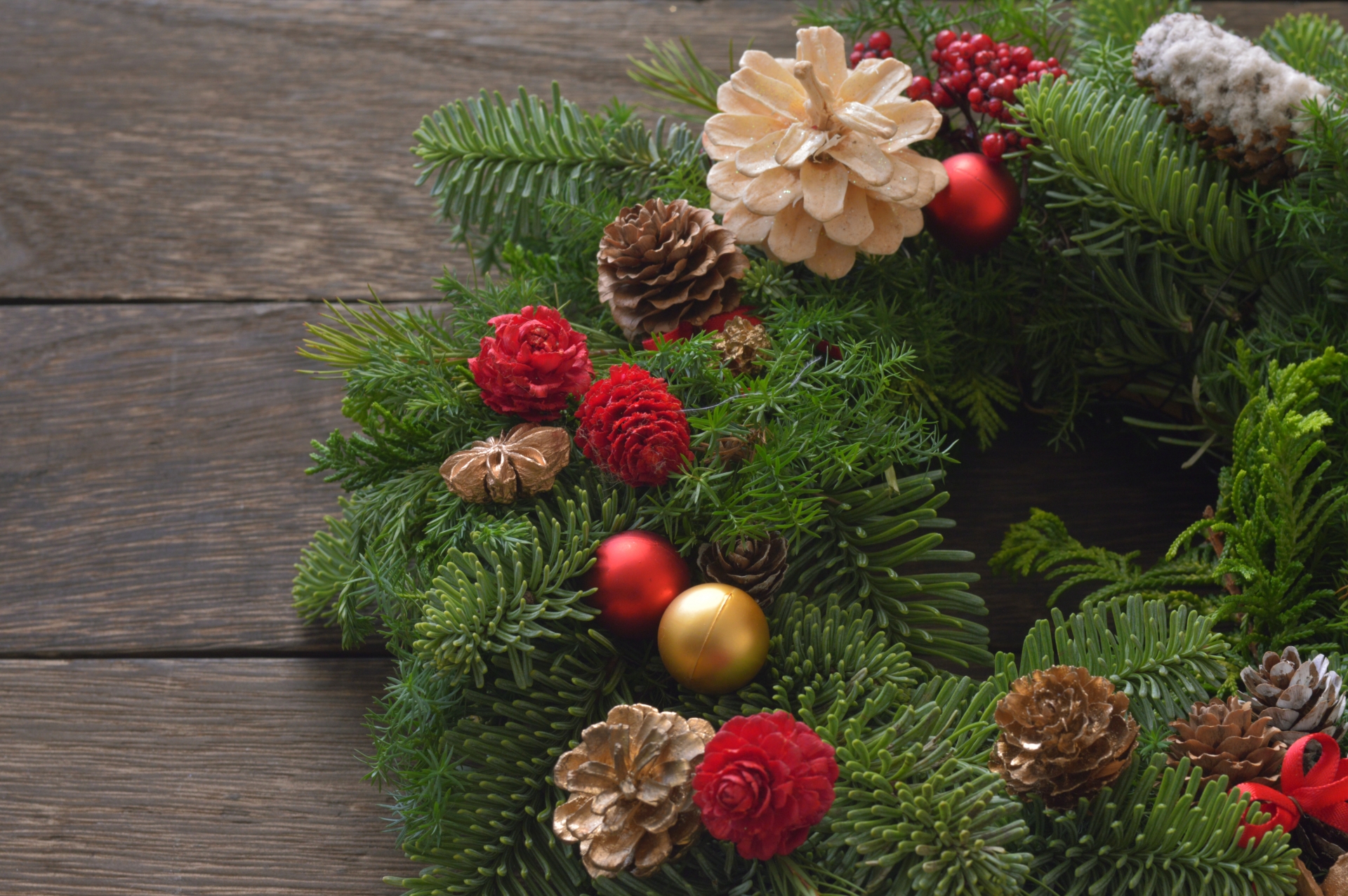 定番のグリーンのリースから、雪をまとったような白いリースまで色々あります。