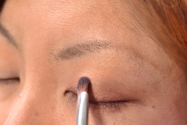 オレンジとブラウンの境をよりナチュラルにするためにこのようにボカしていきます。ただしこうすると目尻側のブラウンが発色しすぎてしまうこともありますので、少しずつブラウンを重ね塗りするようにしてください。