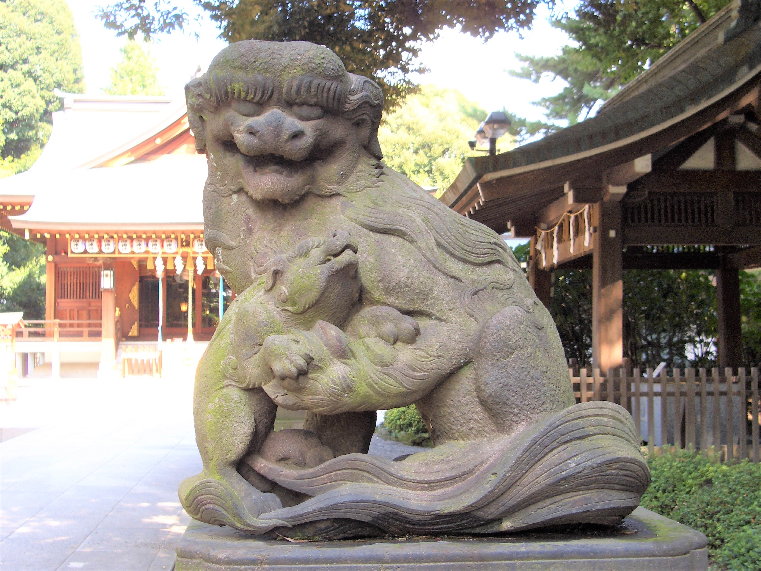 子供を抱えている中野沼袋氷川神社の狛犬。