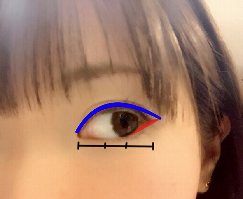 一重さんの幅広メイクでは上まぶただけでなく、下からもラインをつなげてあげましょう。下の画像で見る通り、目を3分割して目尻側1/3から埋めていくのがポイントです。