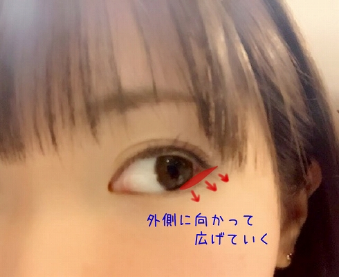 このときあくまで目の横幅を広げるためにシャドウを乗せるものなので、黒目の外側からナチュラルに描き入れるようにします。