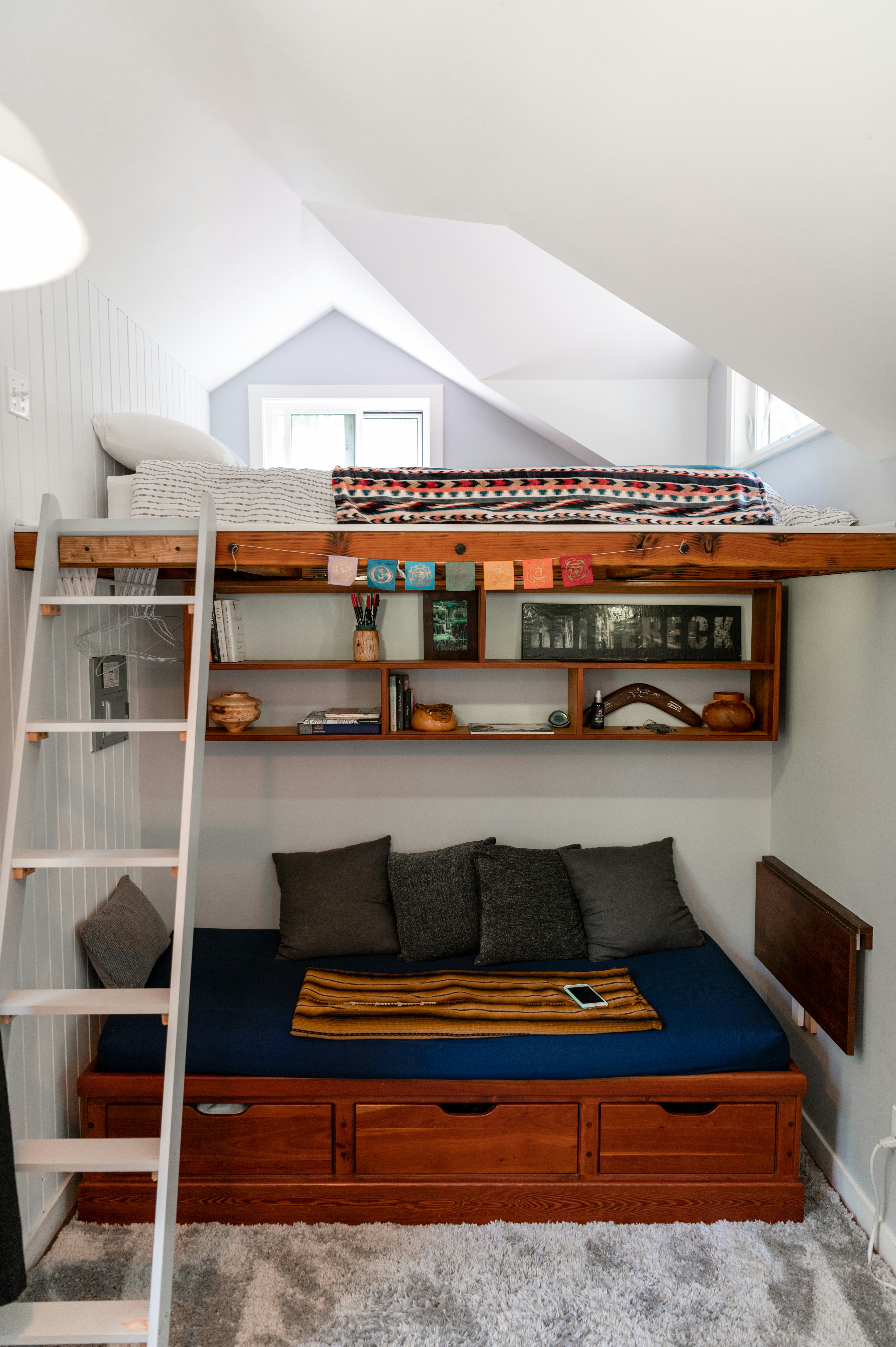 リビング部分に階段をつけて、少し上げているだけで、高級感も出ています。狭い空間ながらも、広々と使えていて、タイニーハウスのインテリアのいい見本だと思います。