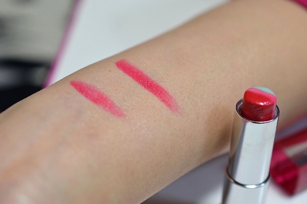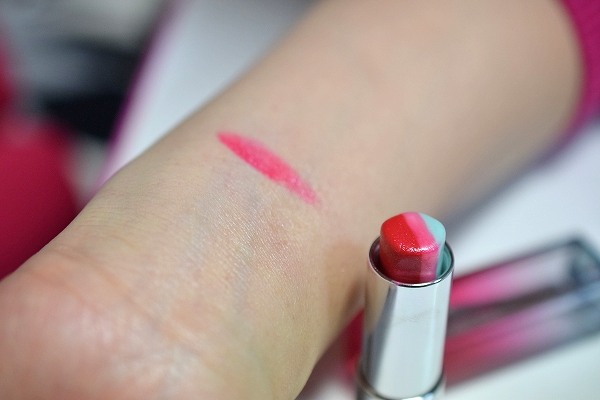 さらに一番外側のハイライトカラーの発色が気になるところですが、見た目のように青くはなりません。重ねても同様で、リップラインを美しく際立たせてくれる役割なのでしょう。ほぼクリアな発色と考えても大丈夫ですよ。