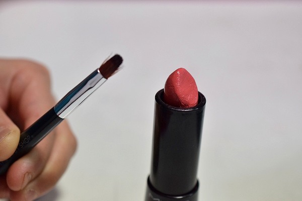 リップブラシで唇の内側、半分ほどを目安に塗っていきます。