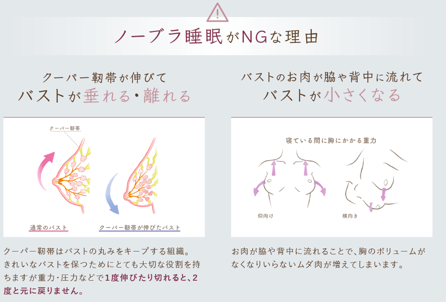 育乳サロンの方のコメントを拝借すると、キレイな胸をつくるためには睡眠時にナイトブラを付けるのは当たり前なのだそうです。ブラをつけずに寝ると胸の脂肪が分散してしまうんですね。